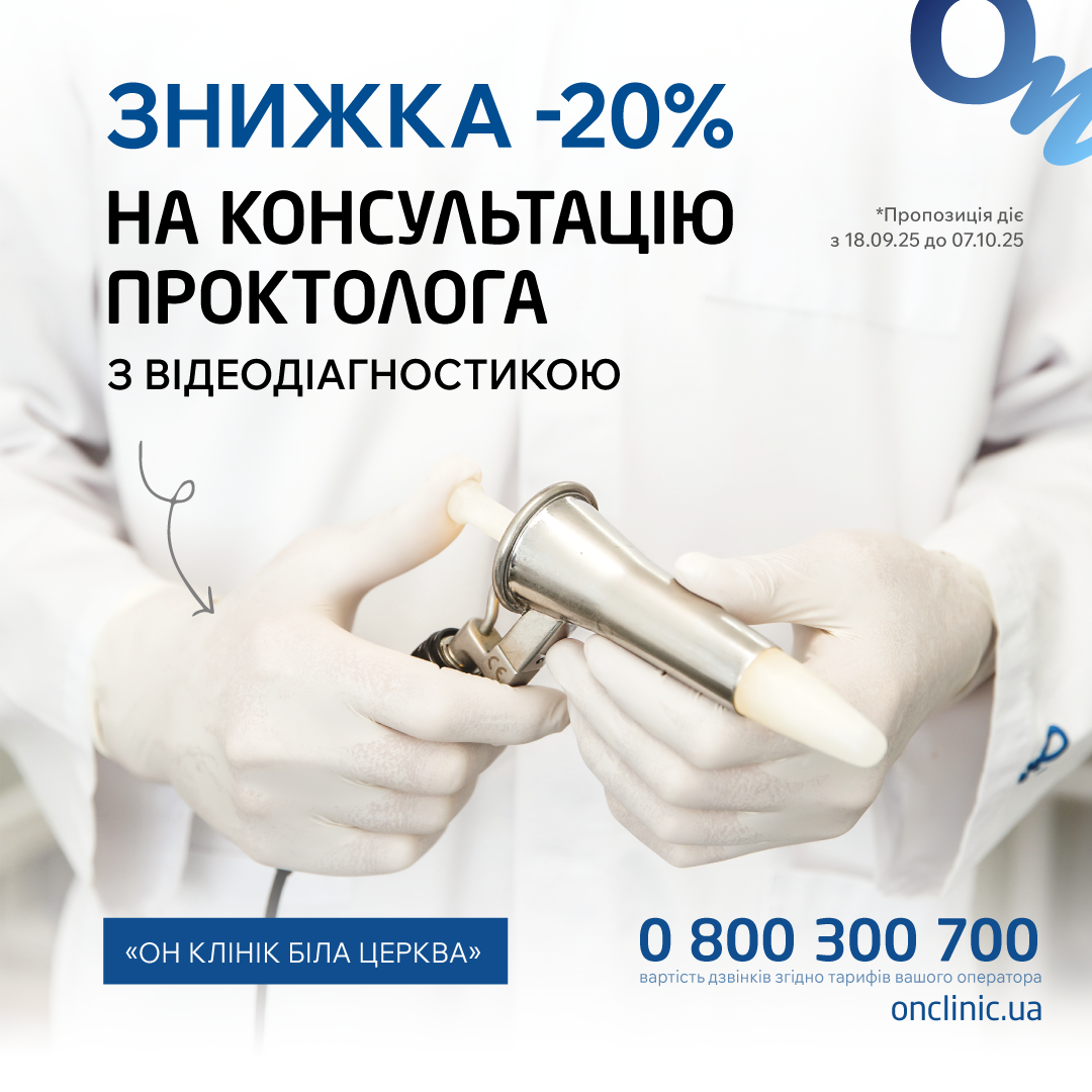 З 18.09.25-07.10.25 в «ОН Клінік Біла Церква» діє знижка -20% на консультацію проктолога з відеодіагностикою.
