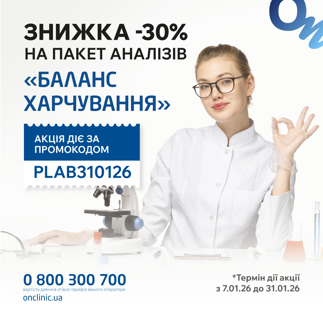 Інформуємо вас, що з 07.01.26-31.01.26 в медичному центрі «ОН Клінік Біла Церква » діє знижка 30% на пакет аналізів “Баланс харчування”.