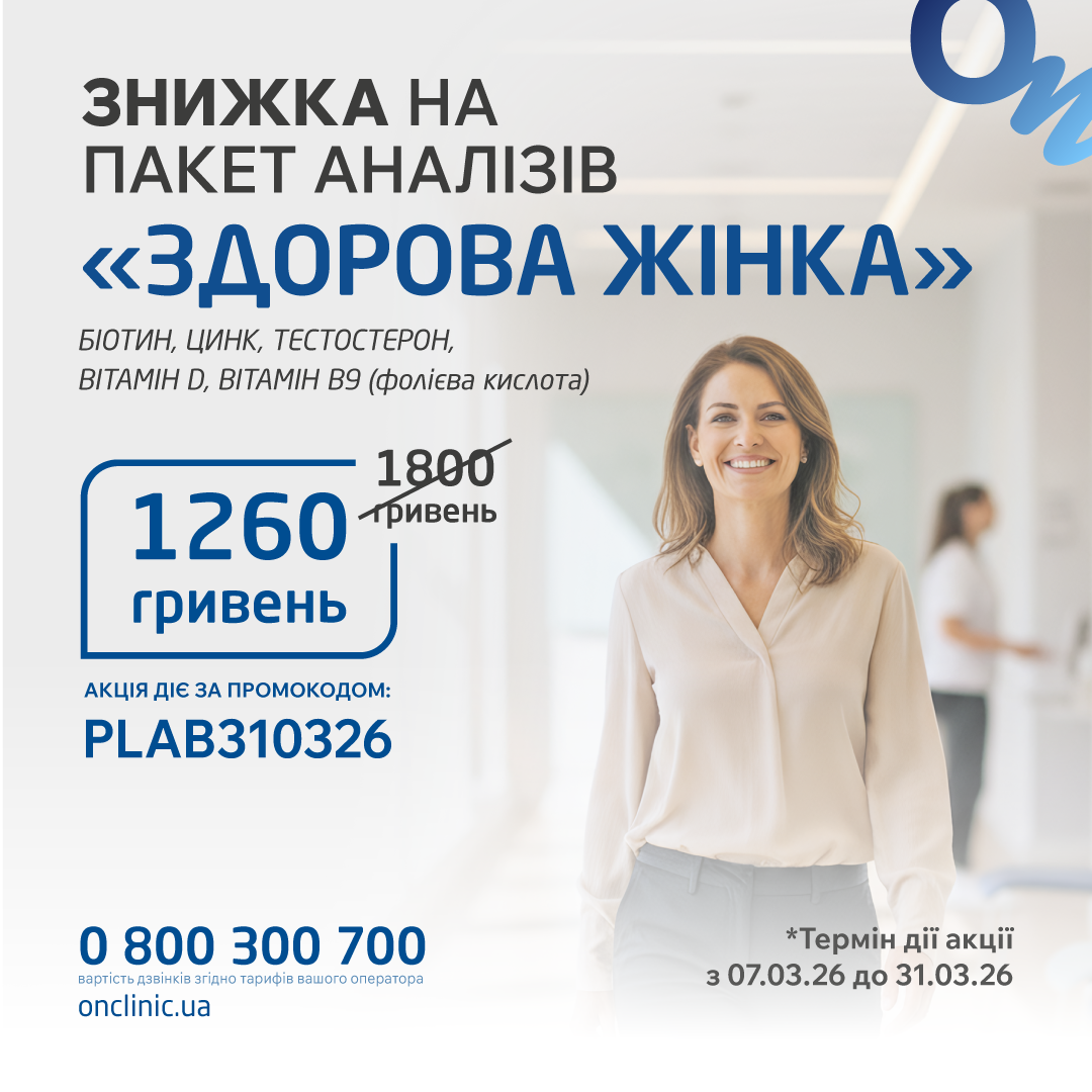 З 07.03.26-31.03.26 в медичному центрі «ОН Клінік Біла Церква» діє знижка 30% на пакет аналізів "Здорова жінка".